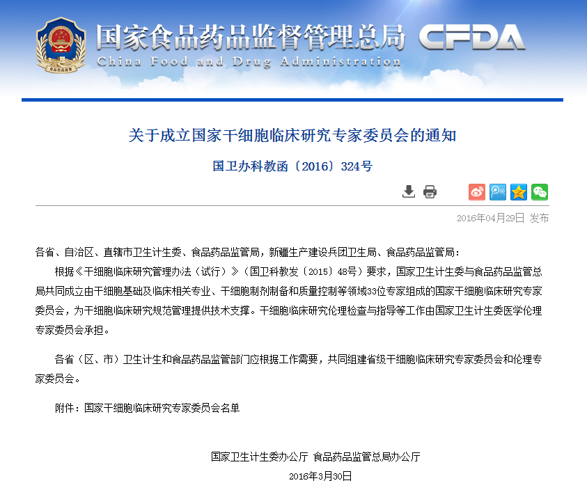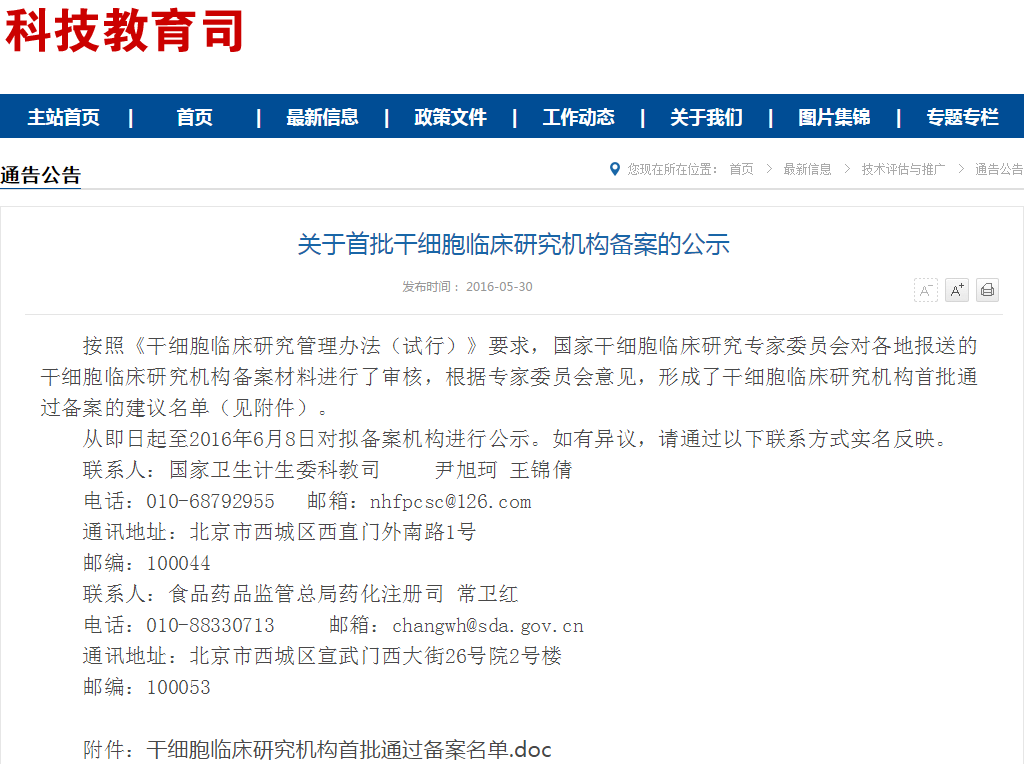 按照《干細胞臨床研究管理辦法(試行)》要求,國家干細胞臨床研究專家委員會對各地報送的干細胞臨床研究機構(gòu)備案材料進行了審核,根據(jù)專家委員會意見,形成了干細胞臨床研究機構(gòu)首批通過備案的建議名單(見附件)。 從即日起至2016年6月8日對擬備案機構(gòu)進…